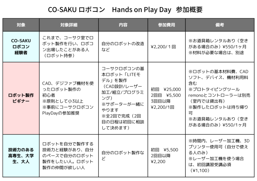 ▼参加対象と参加料金(ロボット製作ビギナーの方は、事前決済です)