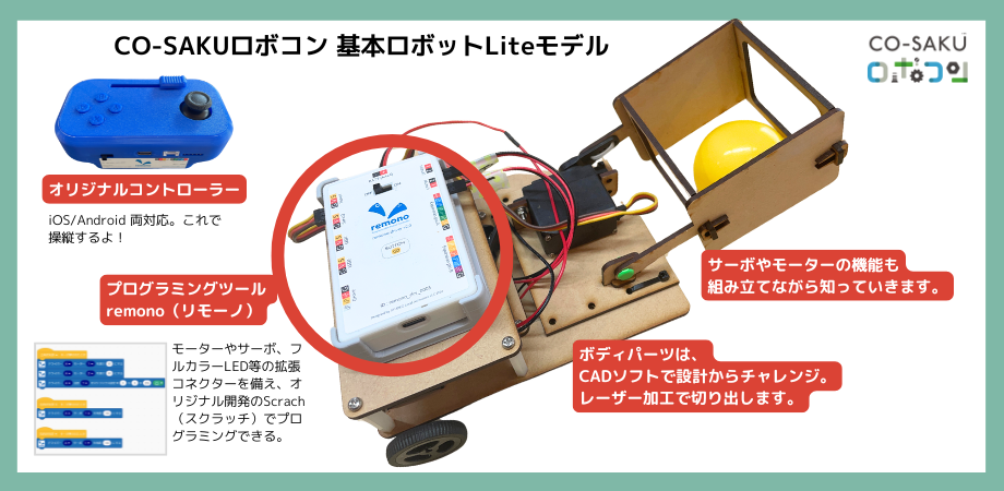 4月から、ロボット製作が初めての人はサポーターが伴走し、ワークショップ形式で基本ロボット製作を設計からチャレンジいただけるようにしました。製作するのは、CO-SAKUロボコンの基本ロボット「Liteモデル」です。ボディパーツをCADで設計、レーザー加工、サーボやモーターの機能を確認しながら組み立て、そしてロボットの動きをプログラミング。ロボットキットでは経験できない内容です。原則として小学3年生以上から大人までご参加いただけます。