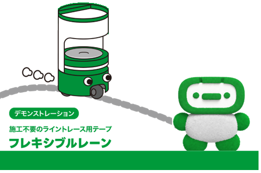 ロボットベースによる、施工不要のライントレース用テープ「フレキシブルレーン」のデモ機。搬送ロボット等の誘導に活用可能です。