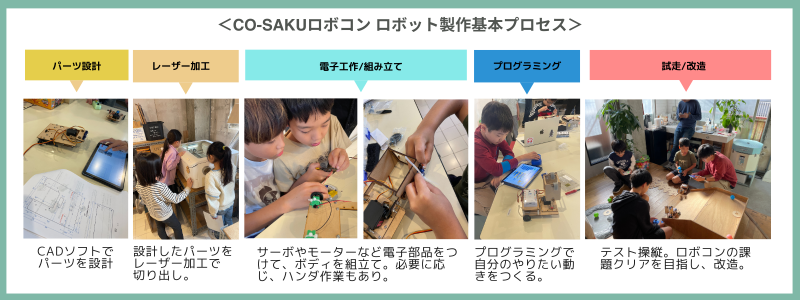 CO-SAKUロボコンのロボット製作は、パーツ設計・加工、組み立て・電子工作、プログラミング、そして改造まで、プロダクト開発の一連のプロセスを含んでいます。基本ロボットの設計図はありますが、整えられたロボットキットを組み立てるのとは異なります。率直に言って、誰もが簡単に取り組める、というものではないのです。
