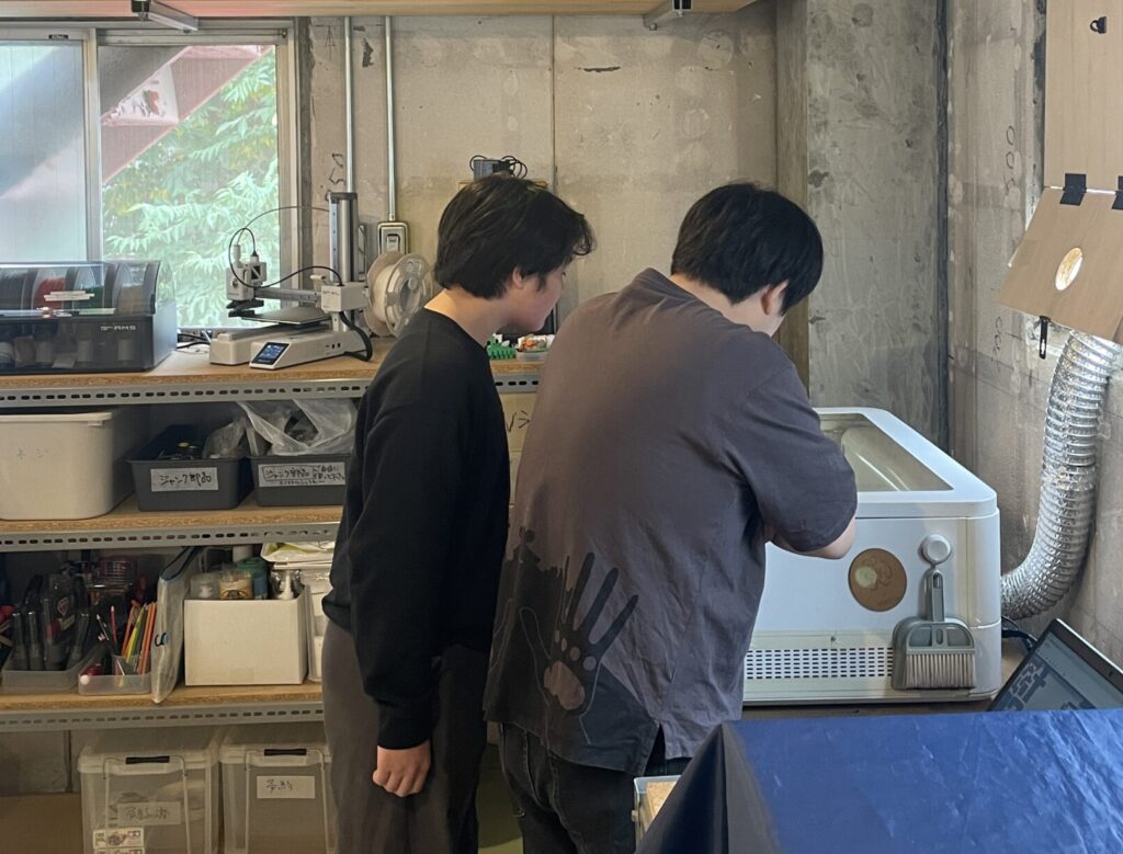 ▲設計したパーツをレーザー加工で切り出します。初めて見るレーザー加工の様子に興味津々