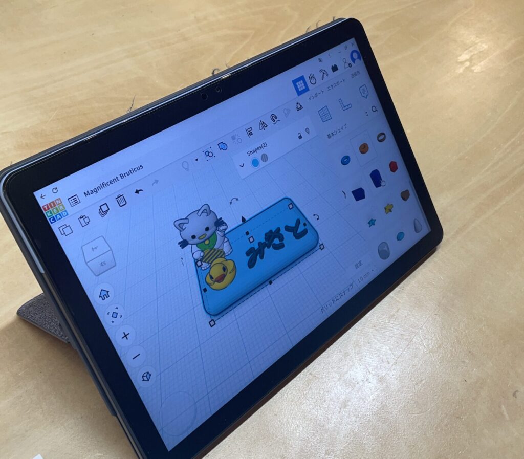 ▲Tinkercadを使って3Dデータを製作中。隣のテーブルには3Dプリンター「Bambu A1mini」を置いて、近くで見られるようにしました