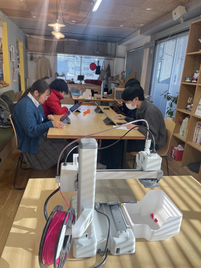 使ったCADソフトはTinkercad、高校生ともなれば触って直感的に操作がわかって、どんどんデータ制作は進みます。3Dプリンターの扱いも、フィラメントのセッティングからやってもらいましたが、モニターを見てあっという間にできました。そう、教えることなんて、ほとんどないのです。